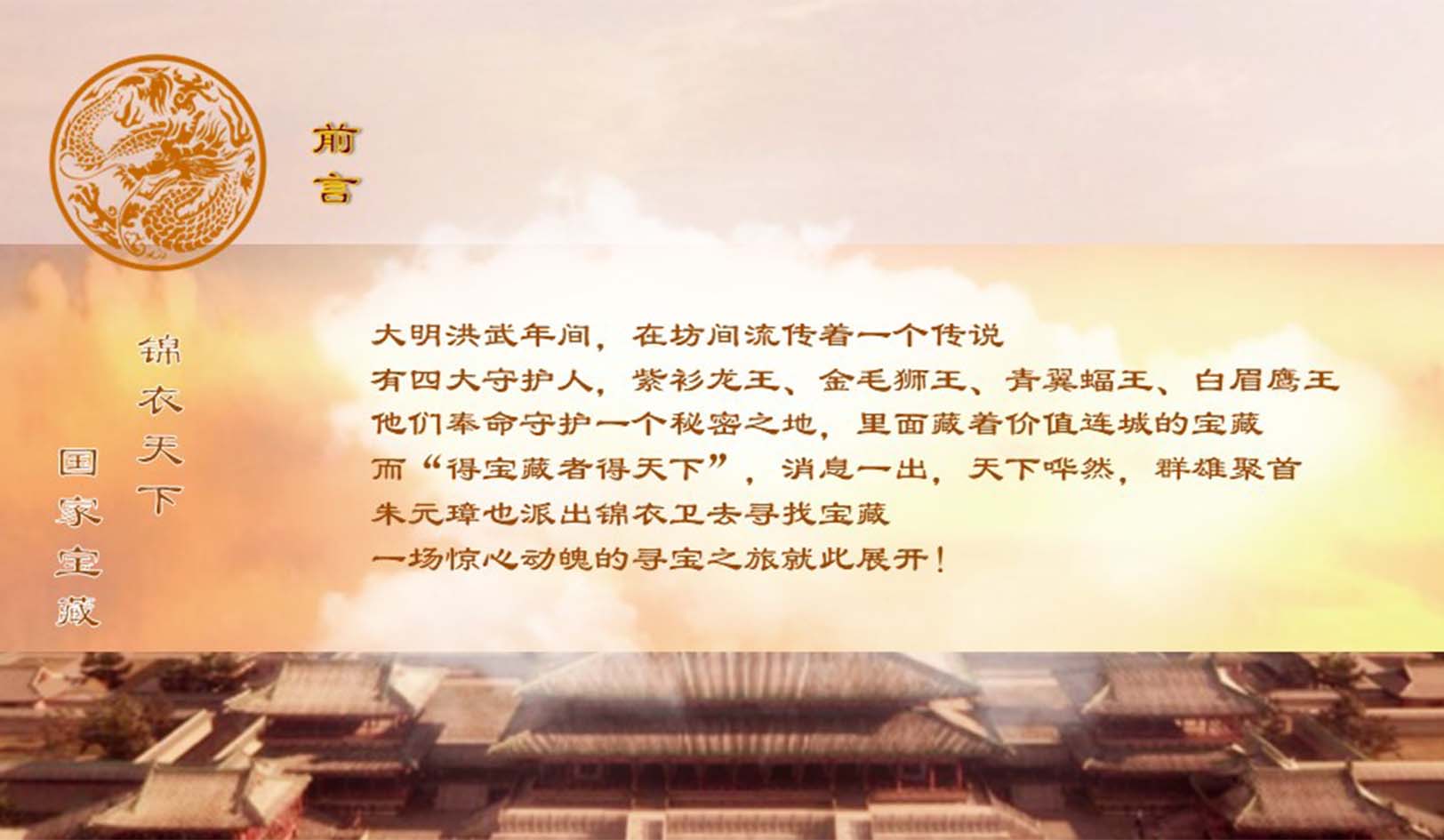 大明洪武年间,在坊间流传着一个传说,有四大守护人,紫衫龙王、金毛狮王、青翼蝠王、白眉鹰王,他们奉命守护一个秘密之地,里面藏着价值连城的宝藏,而“得宝藏者得天下”,消息一出,天下哗然,群雄聚首,朱元璋也派出锦衣卫去寻找宝藏,一场惊心动魄的寻宝之旅就此展开!